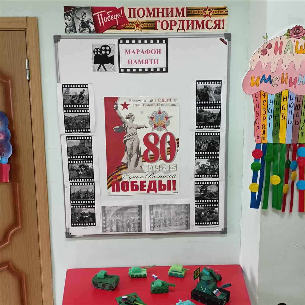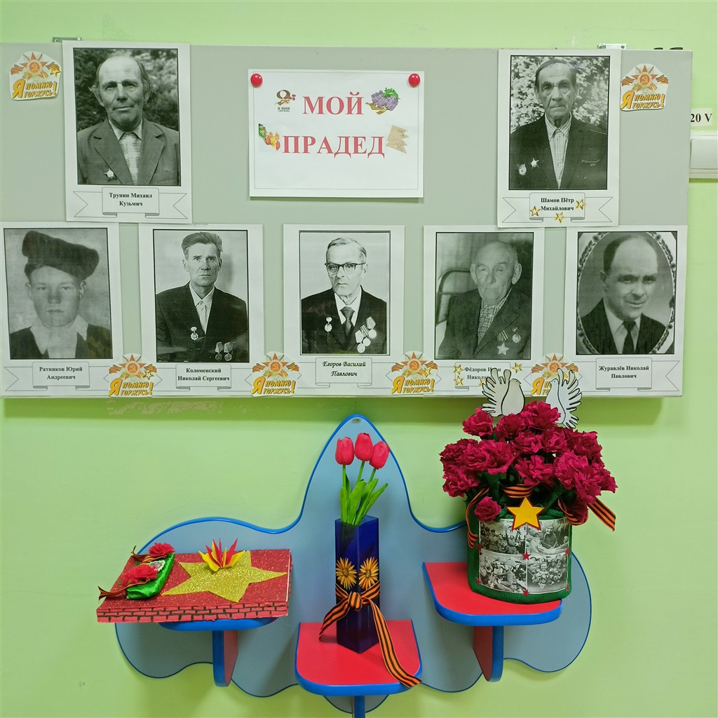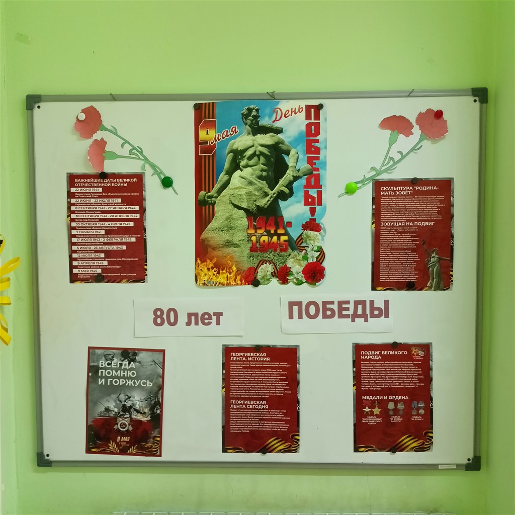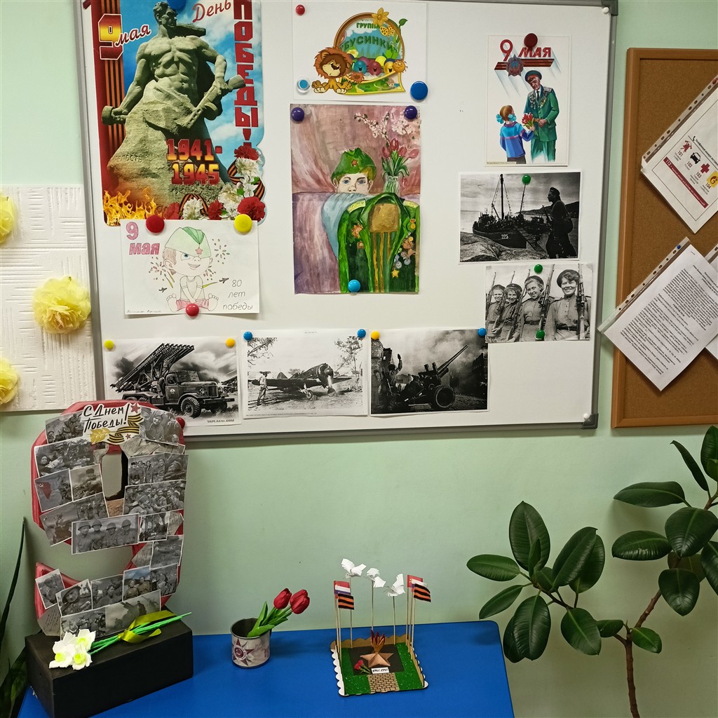 День Победы — великий праздник! В этом, юбилейном, году подготовка к нему идёт с особым размахом. В нашем детском саду педагоги оформили тематические выставки, украсили окна к Дню Победы, с детьми подготовили поздравительные открытки ветеранам, родители нарисовали плакаты, сделали поделки. Данными мероприятиями воспитываются и укрепляются чувства патриотизма, любви к Родине и гордости за подвиг соотечественников в тяжелые годы войны. Нельзя забывать свою историю. Подрастающее поколение должно помнить и знать о мужестве и героизме советского народа, проявленных во время Великой Отечественной войны. Эти знания должны быть заложены в самом раннем детстве, пронесены через всю жизнь и передаться потомкам.
